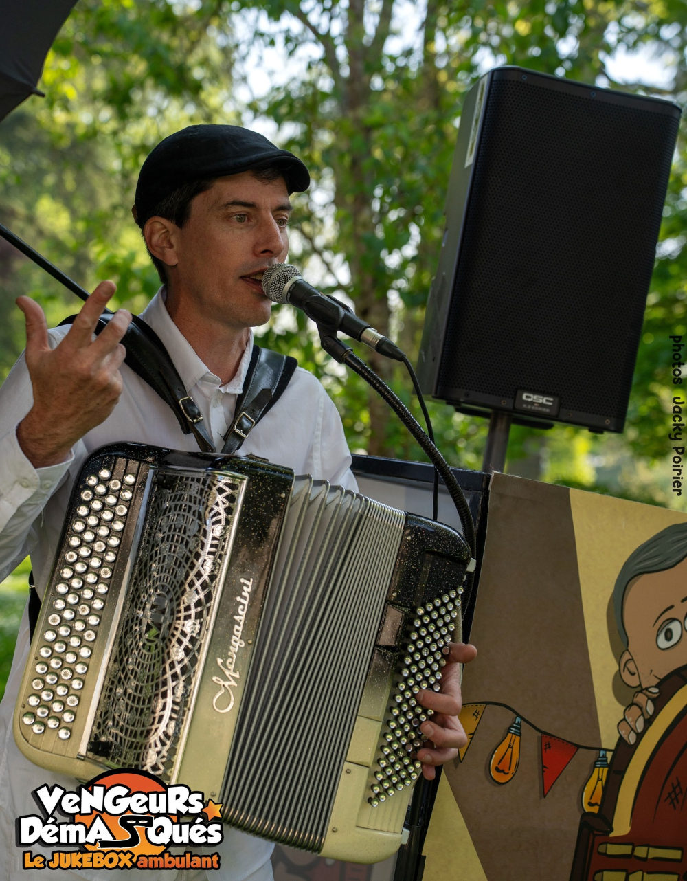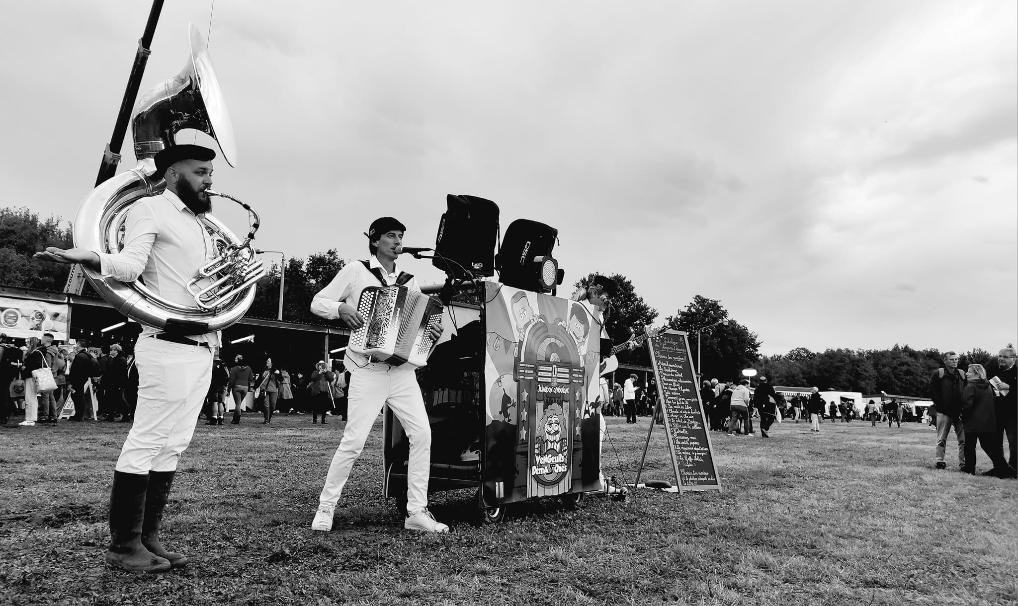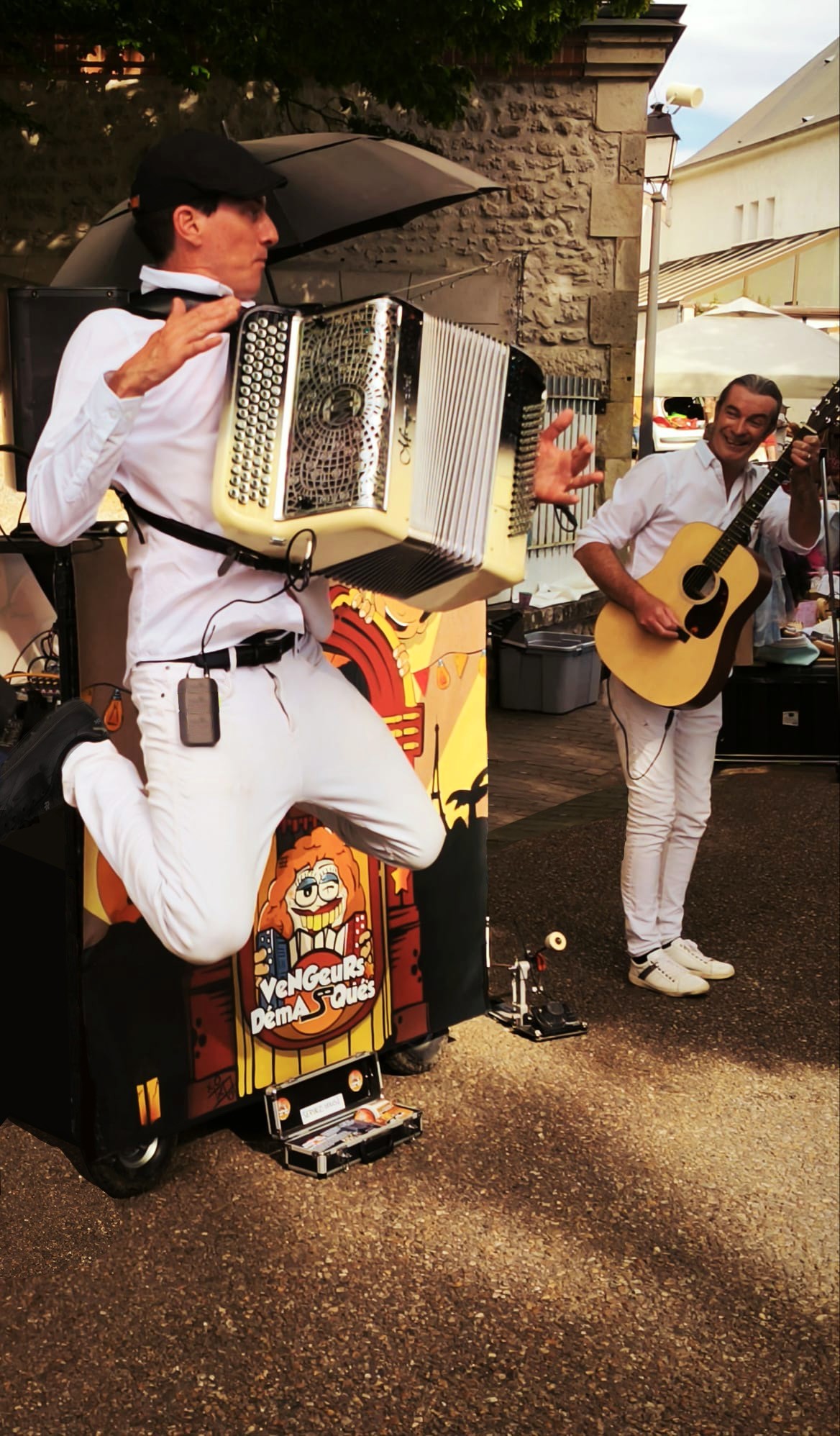 Vous n'avez rien à faire, l'ensemble est autonome et s'adapte à votre événement en plusieurs sessions sur la journée. Le Jukebox a déjà joué pour les fêtes de village, Offices de tourismes, marchés culturels, festivals & manifestations culturelles, très gros parcs d'attractions et lieux touristiques,.... L'accordéon, la guitare swing, et le kick rythmique embarqueront vos festivaliers pour une vraie ambiance joyeuse, dansante et chantante ! Une alternative originale et rapide à installer à la Grande Guinguette Chansons Françaises sur scène des Vengeurs Démasqués.
