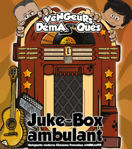 Ambiance rétro interactive garantie avec ce faux juke-box façon BD ! Choisissez votre numéro de titre, et les comparses des Vengeurs Démasqués mettent à profit leur grande expérience de la scène pour reprendre les standards de la chanson Française en mode Accordéon / Guitare sur-vitaminée!