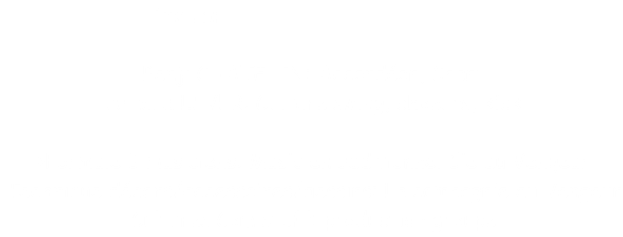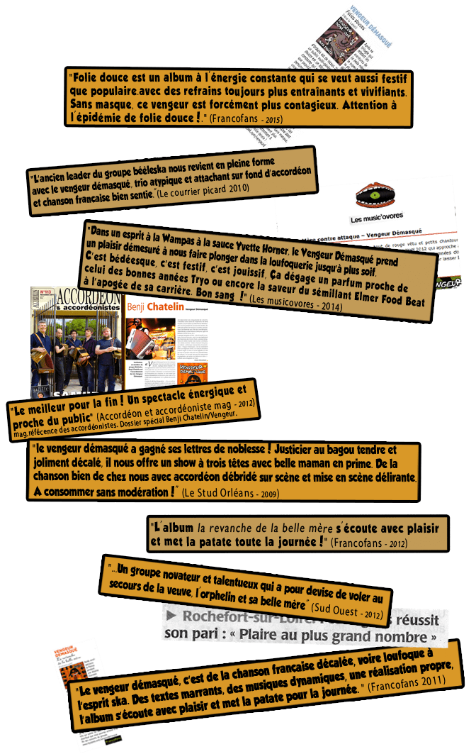Sous la gouaille de Benji Chatelin (ex leader Béèleska ref: zénith, smac, festivals, printemps de Bourges...), le vengeur démasqué vous a invité en costume de super zéros dans son univers